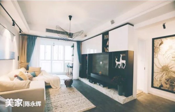 因为空间有限,所以客厅采用了无茶几的设计,留出了更多的空间给家人和孩子玩耍。黑白相间的到顶电视柜满足了家里的收纳需求。这样的黑白经典色彩搭配,让客厅看起来更加立体化。
