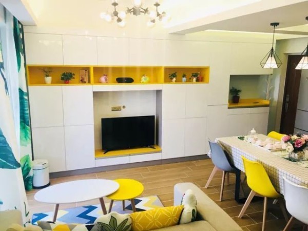 抛开常见的电视,使用投影仪替换。适当的墙面留白,能够让人感觉到轻松活泼。吊柜组合的柜体能够满足家里的日常需求。