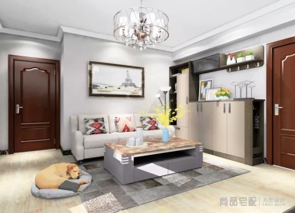 沙发侧边的贴墙玄关柜,采用敞门和掩门方式的组合,方便储物的同时,兼具展示功能。