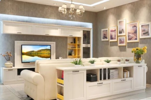 错落有致的地柜组合,加上吊柜及隔板,电视背景墙就这么装饰好了。在吊柜上摆放一些花艺和艺术品,这能瞬间提升了客厅的格调。
