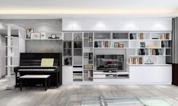 藏书阁式的电视柜设计,适合家里有比较多藏书和藏品的朋友。同时,在电视柜旁边打造一个音乐小天地,兴致来的时候,在这里轻弹一曲,给生活增添一些姿彩。