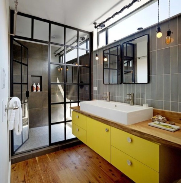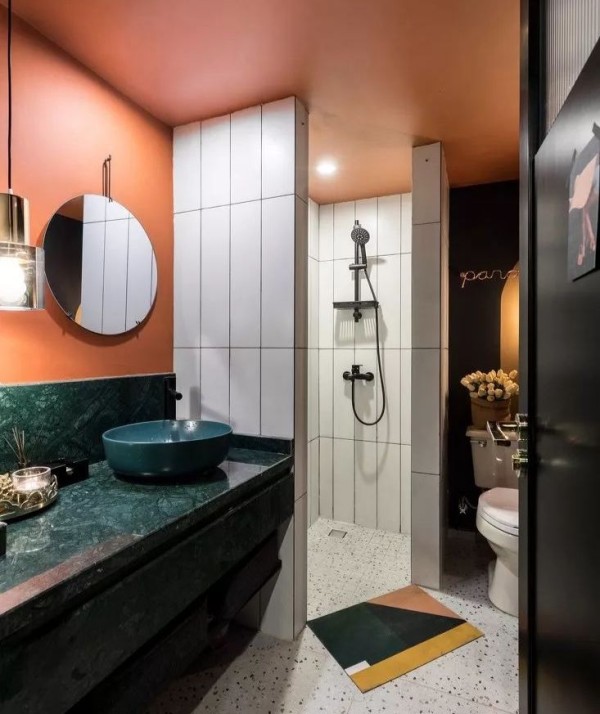 ▲像这样八字墙隔出来的钻石淋浴空间,搭配大胆的红色、墨绿色别有一番风格,但也有水汽外流的缺点。