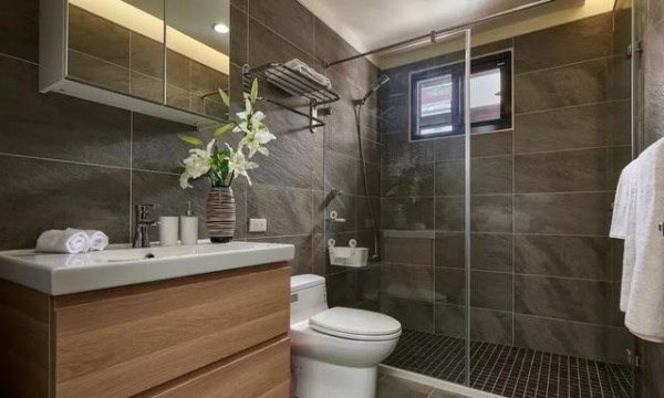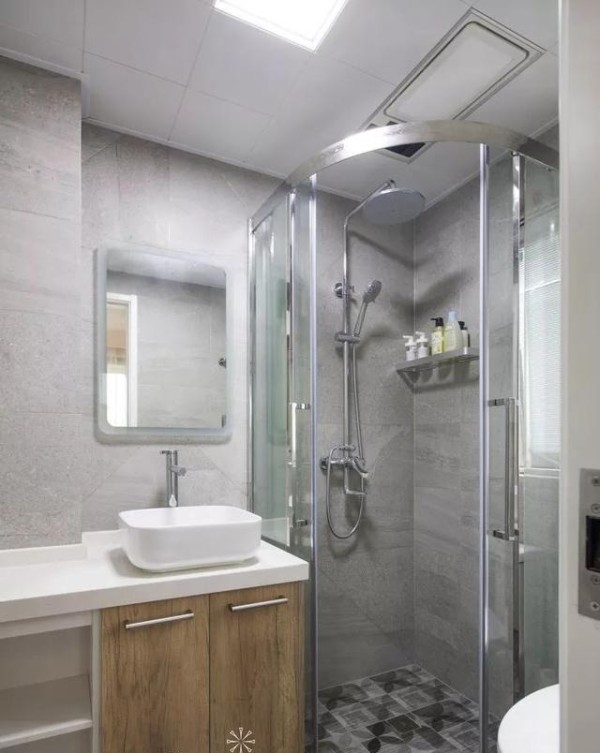 洗手台外置,门内是马桶和淋浴区。比较适用于成员多的家庭,这样的设计能大大提升卫生间的使用效率。