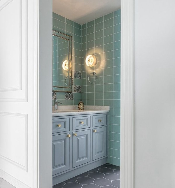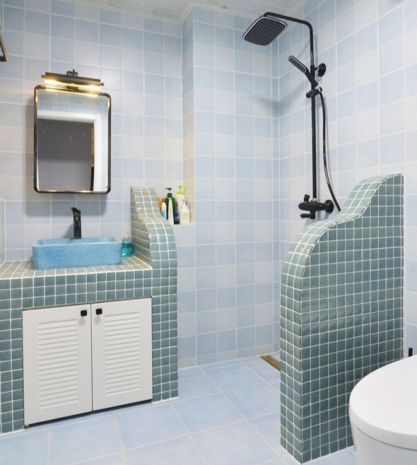 洗手台、马桶、淋浴区采用半墙隔断的方式将空间进行区分,但彼此之间又隔而不断,自成一体。