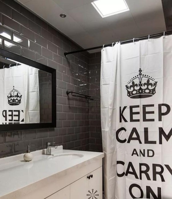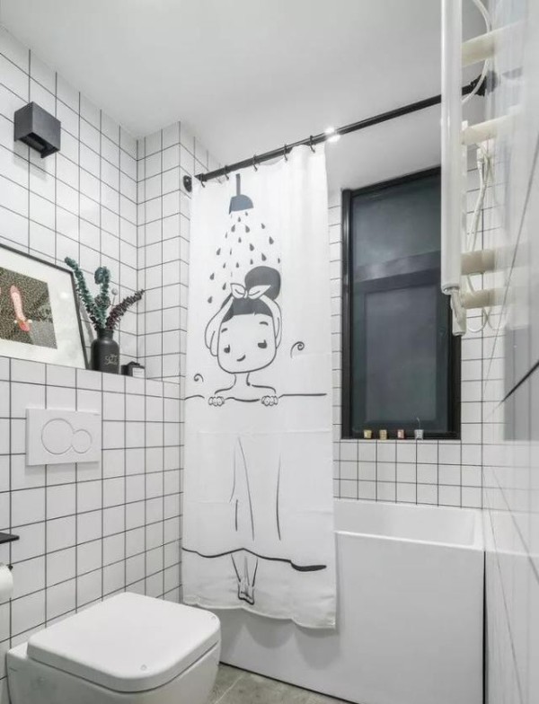 如果空间小装玻璃门不方便,可以试试一字型浴帘。便宜、省空间,还不用擦玻璃。实乃刚需之王!