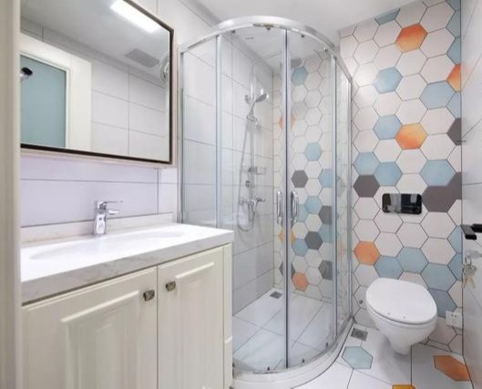 如果觉得钻石形浴室开关门不方便,那么不妨试试弧形浴室。平移玻璃门节省了很多空间,弧形使得整个空间线条更加流畅。只需一个角落,但对推拉门的质量要求较高。
