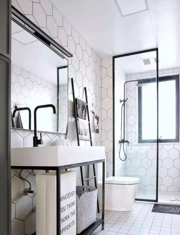 而这款卫生间设计亮点,大家应该都能看出来,整个墙壁都统一铺的白色六边形瓷砖。既有时尚漂亮效果,也让卫生间增彩不少、毕竟除了要实用,颜值也不能差。洗手台的形式,底部直接镂空,放东西很方便。