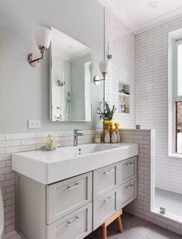 对于一个卫生间来说,除了要做干湿分离、美观之外,收纳也要很重要的。一半大家会在洗手台底部打柜子。如果条件允许,像这款在墙壁上装收纳柜子,很实用。