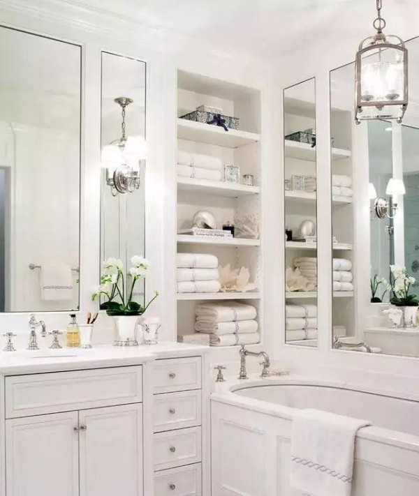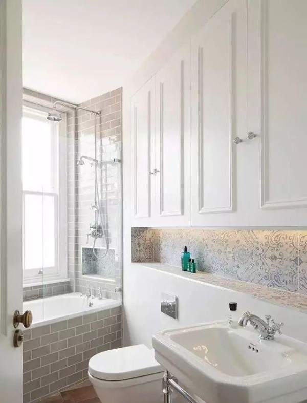 看这种卫生间,收纳简直不要太强,浴缸一端墙壁上,设了很多柜子,是不是功能很强大,也美观。如果大家的条件允许,这种设计最合适不过了。