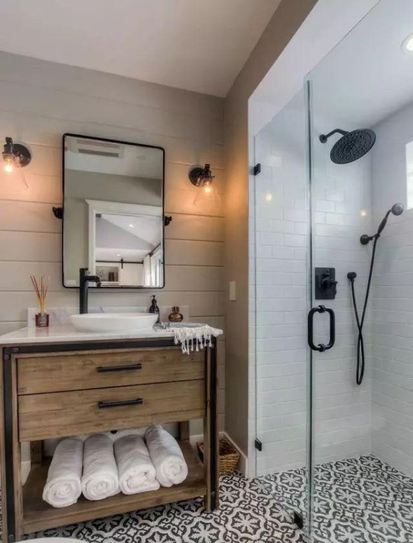 很多人设计卫生间,都很谨慎的使用深色调,担心让空间变得紧促。其实只有不要大面积使用,或者局部点缀,也可以彰显出独特的一面。像这款花洒喷头、壁灯、水龙头,挺与众不同的,地面瓷砖更亮眼。