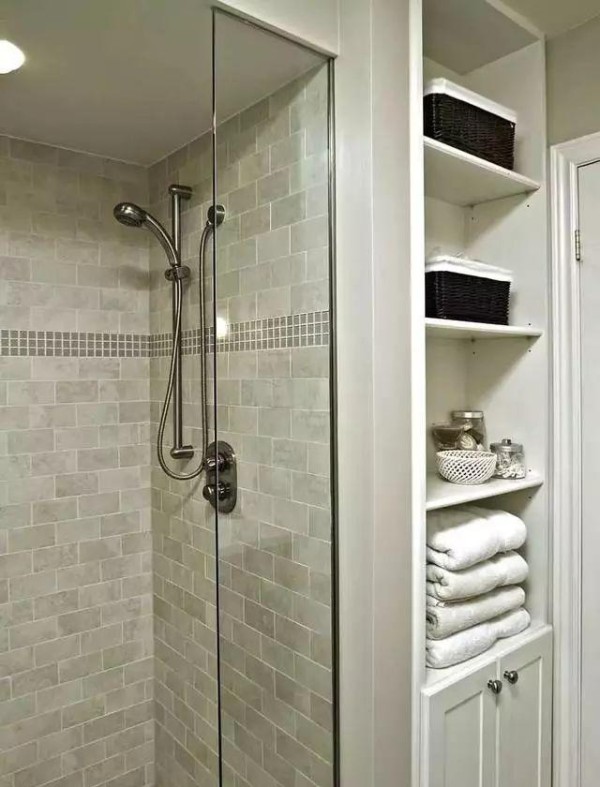 要让卫生间收纳变强,方式还有很多种,就看你会不会利用好墙壁。这款在门后方墙壁上,装了一处嵌入式收纳柜,不大却足够满足日常物品的收纳。比如浴巾、沐浴用品等。