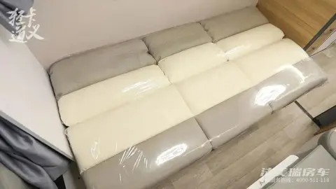 生活区有一张超大沙发,可容纳4-5人。下面隐藏3个超大抽屉,日常的换洗衣物都可以放置在这里,沙发柔软舒适,可以变身沙发床。另一边是卡座区也可以变身卡座床 ,睡觉时还可以打开前方的32寸大电视放松娱乐一下哦。