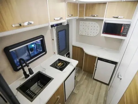 后置厨卫房车的设计更加便利。厨房和卫生间都位于后部,拥有移门不仅可以减少前部的异味和噪音,还能够让居住者更加方便地使用。厨房通常配备了电磁炉、冰箱、微波炉等设备,可以满足人们在房车中烹饪的需求。