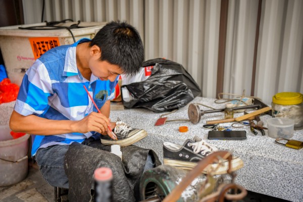 民主村惠民巧匠坊,黄师傅正为居民修补鞋子。 本版图片由记者 曹鸣鸥 摄