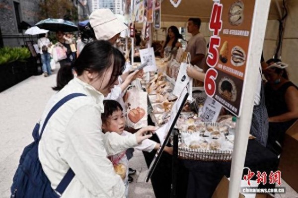 10月2日,市民带着孩子购买面包。近日,全新升级的“一起发酵吧”面包文化节在上海苏河湾万象天地慎余里广场举行,来自全国各地的优质面包品牌,从松软的日式吐司、酥脆的可颂,到创意十足的馅料面包、健康的全麦面包汇聚在此,方便市民品尝并选购。同时,现场还有周边伴手礼free兑换,打卡集章抽奖,diy等惊喜活动。中新社记者 殷立勤 摄