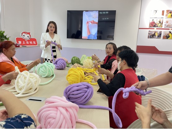 老师向大家介绍了此次手工制作的程序,包括操作流程、制作要点等,并给大家分发了制作材料包。大家一边互相帮助一边互动交流,畅聊编织经验,现场不时传出欢笑声,氛围十分融洽。半个多小时后,一个个色彩丰富的手工编织包展现在眼前,阿姨们纷纷表示虽然制作编织包要有足够的耐心和长时间的过程,但是看到自己完成的作品真的太有成就感了,是一次非常开心的体验。
