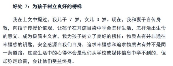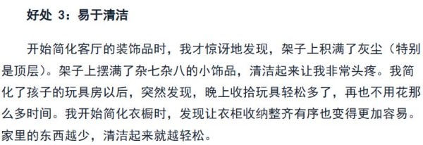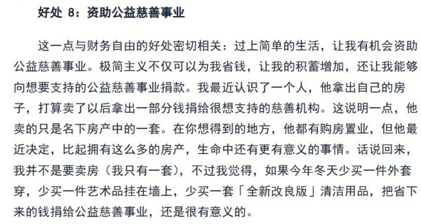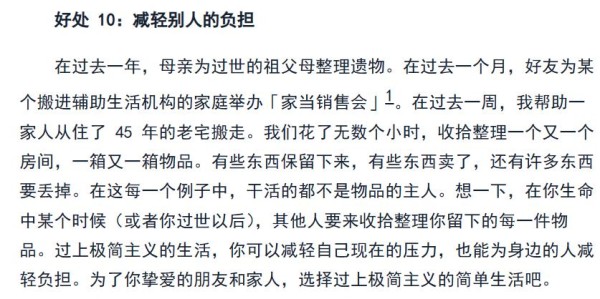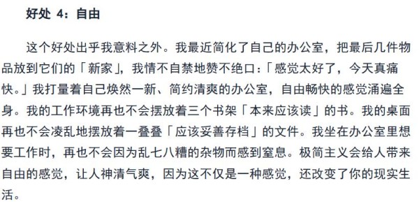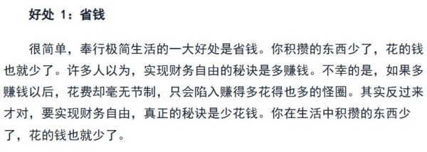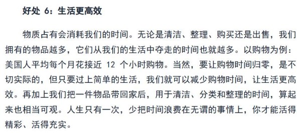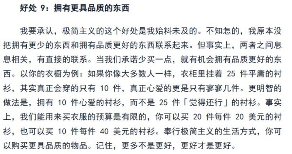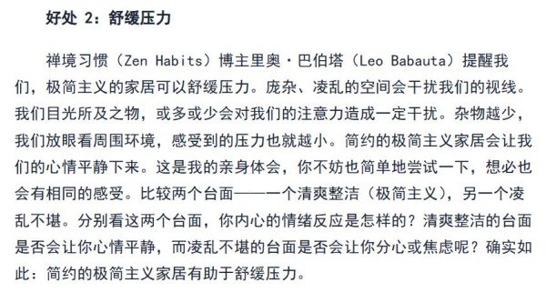 物质方面:极简主义让我们拥有更少的物品,降低了消费和浪费,减少了财务压力和储物空间的需求。精神方面:极简主义通过减少物品和噪音来降低精神上的负担,使我们更加专注和清晰,并提高幸福感。时间方面:极简主义让我们摆脱不必要的事情和关系,释放出更多时间来追求自己的梦想和目标。健康方面:极简主义鼓励健康的生活方式,如健康饮食、运动和睡眠,从而提高身体和心理健康。关系方面:极简主义让我们集中精力发展最重要的关系,创造更深层次的联系和更大的互信。环境方面:极简主义通过减少消费和浪费,减轻了我们对环境的影响,促进了可持续发展。自我实现方面:极简主义让我们更加专注于自己的价值观和目标,帮助我们实现自我发展和成长。践行极简主要有以下几个方面: