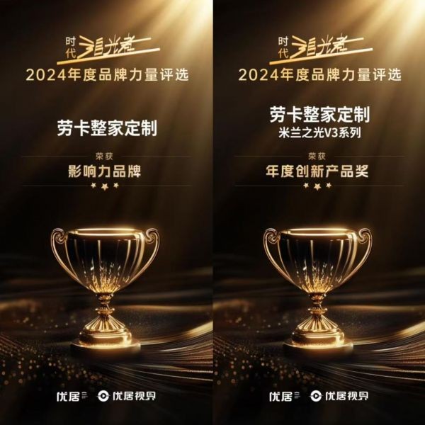 近期,由优居和广州市海珠区投资促进局联合主办的“数智破困局 高效新增长”2025中国数智营销峰会如期举行,“时代追光者”2024年度中国品牌力量评选颁奖盛典也圆满落幕,年度榜单正式揭晓。劳卡整家定制及其米兰之光V3系列产品在家居行业业界人士、媒体朋友、广大消费者的见证下,分别荣获年度影响力品牌和年度创新产品奖,彰显品牌的强大实力。