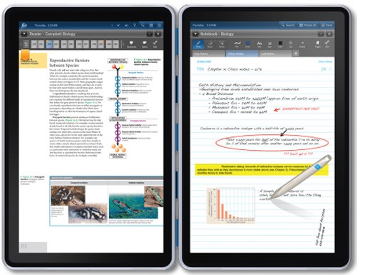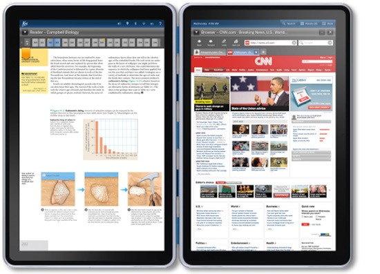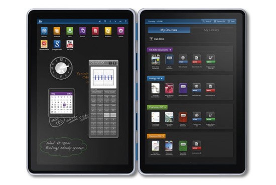 上网本火爆了电子书火爆,电子书火爆了iPad之类的平板电脑又成为了市场的明星,这类的智能设备做得越来越小,应用也越来越厉害。kno是一家平板电脑设备厂商,最近带来的同名方案采用双屏设计,类似的方案其实微软也有过构想,而kno看起来要成熟很多了,两块屏幕可以180度翻转,也能够相互辅助,提高工作效率。