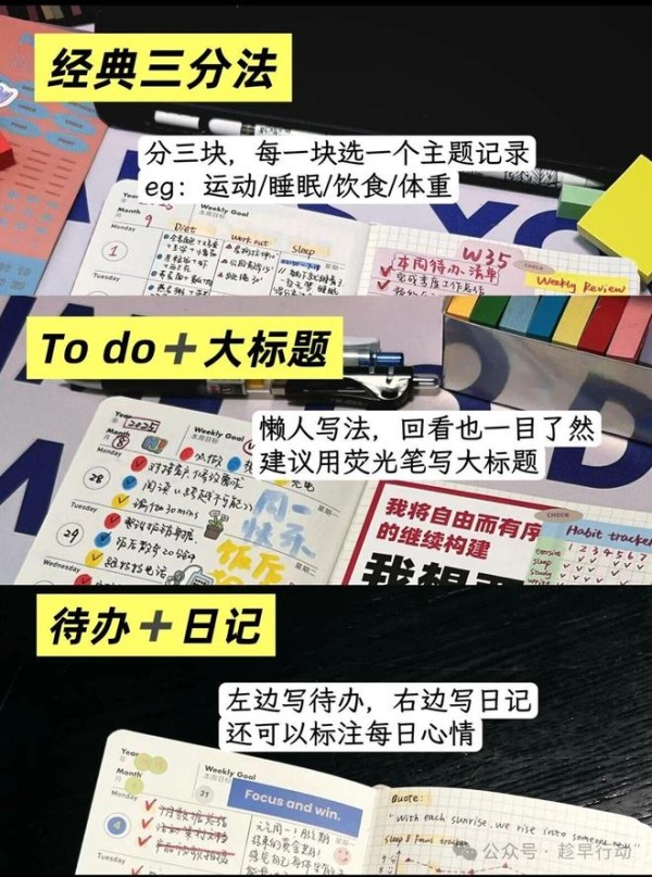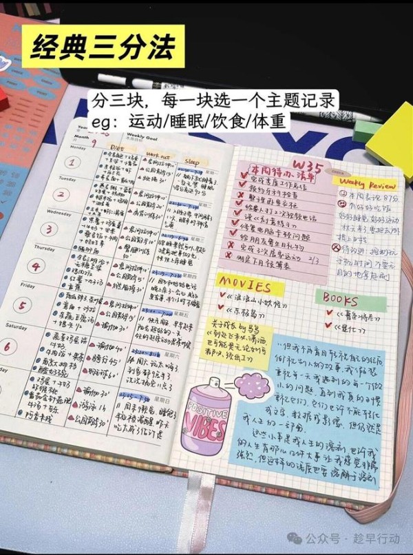 如果觉得周计划太复杂,三分法绝对是入门首选。把页面分成三块,每一块锁定一个核心主题,比如「运动」「睡眠」「饮食」,像给生活做分类收纳,清晰又直观。