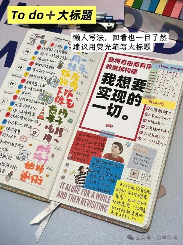 要是喜欢简洁又有重点的记录方式,「TO DO+大标题」会很对你的胃口。先给本周定一个大标题,比如「元气充电周」「专注工作周」,再围绕大标题列出核心待办,标出重点,让一周的目标更清晰。(可以用荧光笔写大标题哦,好看又醒目~)