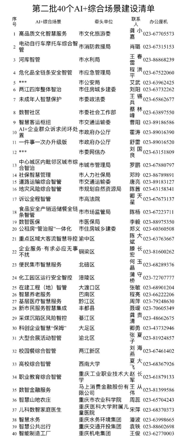 相关负责人表示,第二批清单发布的40个AI+综合场景,是深入贯彻落实中央“人工智能+”行动部署和城市工作会议精神,落实数字重庆建设推进会部署,不断丰富助企兴企高质量发展、高效能社会治理、便捷生产生活服务应用场景。