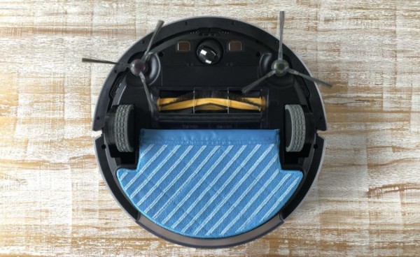它颜值爆表,又实用精巧。把科沃斯地宝DJ35的底面翻过来,可以看到它吃饭的家伙什:扫地的边刷和滚刷、防跌落的传感器、行走的主轮和万向轮、万向轮两侧的充电电极等。