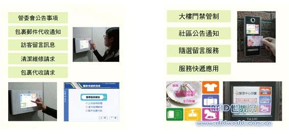 另外,在社区居住的部分,则引进了「智慧型门禁管家」系统,整合「智慧型壁挂资讯站」的建置,利用RFID带来的高科技来做社区的管理员。此套系统不但能让住户透过触碰式萤幕,就可直接读取邻居或访客的留言,更能成为住户居家的小帮手,例如,王先生想要修理家中的瓦斯管线,只需要利用RFID辨识并透过前述智慧型设备即可通知管理室请求维修。相关的维修处理进度,住户不但可透过网路线上查询,也能透过RFID的身分辨识,靠卡即可完成所有查询动作!