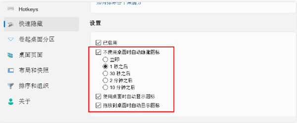 也可以在设置里启用不适用桌面时自动隐藏图标的功能,眼不见心不烦,切回桌面或双击时再显示图标;