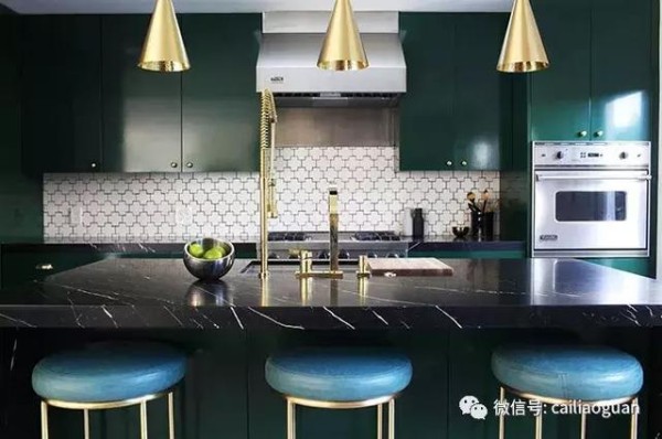 这种具有厚重铸造感的Nightwatch绿色,成为更加情绪化的瓶装绿色替代品,这种色彩和哑光黑色搭配是不错的选择,并且辅以具有高光泽饰面和元素,会带来很好的视觉效果。 但如果一个的房间的空间太大,可以考虑用小而有影响力的方式来带来颜色,比如在上图充满活力的纺织品,或者可以在明亮的大理石地板上设置的深绿色地毯来点缀。