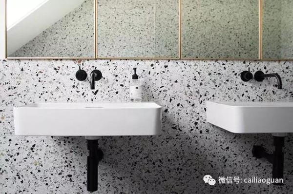 由大理石,石英,花岗岩和玻璃芯片组成的复合材料,唤起俏皮,五彩纸屑般的抽象设计语言,目前已经有很多天才的方式将材料带入家中,比如Terrazzo就涵盖从地板到灯具的所有内容, 甚至浴帘、印刷品等。