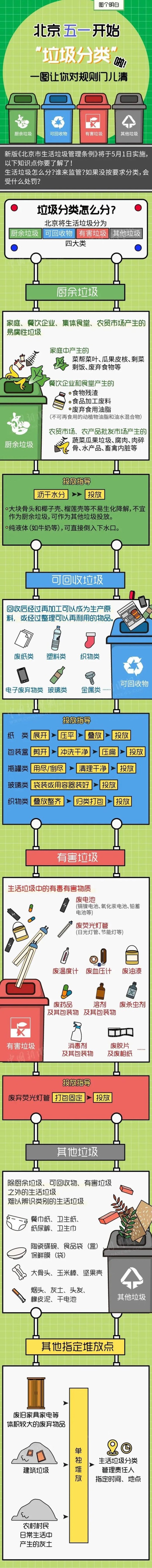 根据条例,北京市生活垃圾可分为厨余垃圾、可回收物、有害垃圾、其他垃圾四类,而垃圾桶的颜色也分别对应绿色、蓝色、红色和灰色,市民须根据垃圾类别对生活垃圾进行分类。