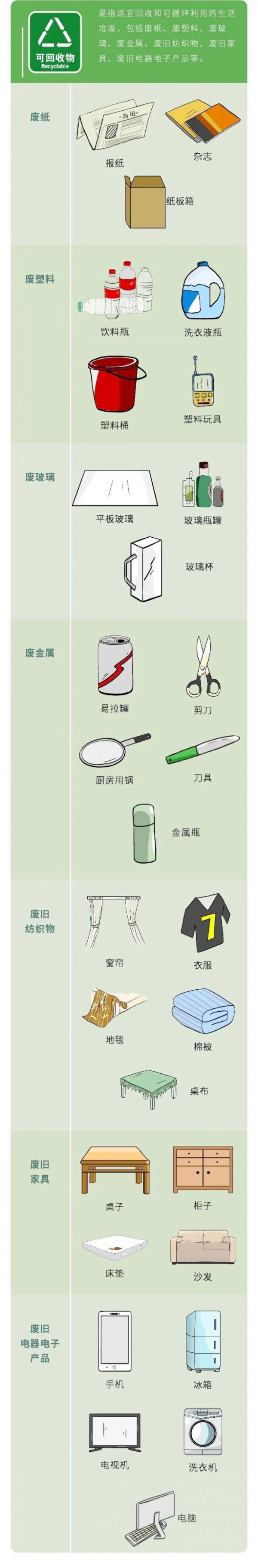 是指适宜回收和可循环利用的生活垃圾,包括废纸、废塑料、废玻璃、废金属、废旧纺织物、废旧家具、废旧电器电子产品等。