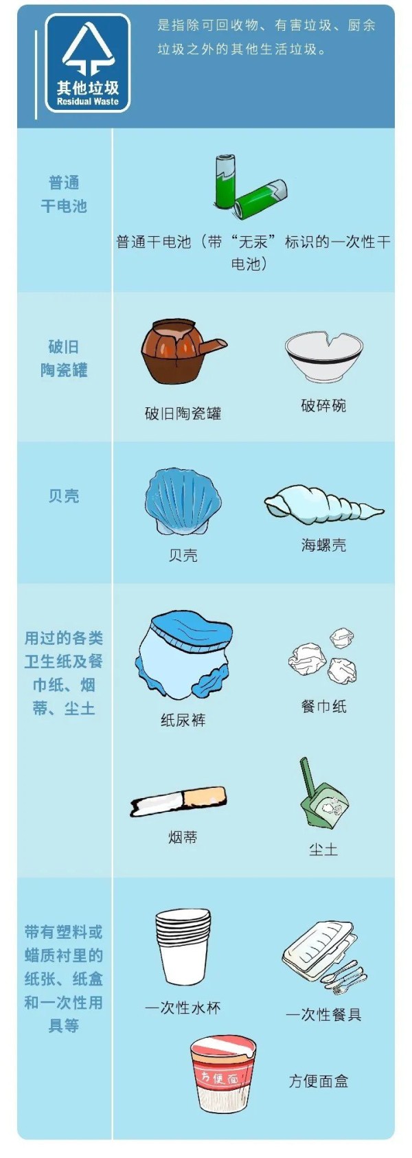 除可回收物、有害垃圾、厨余垃圾、其他垃圾等日常生活垃圾外,生活中还会产生餐厨、建筑(装修)、园林绿化等垃圾,市民及单位应按相关要求分类投放。