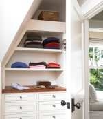 楼梯下、阁楼下,经常存留这样的畸形空间,稍不留意,并错失了一块绝好的收纳区域。像这样,给畸形空间量身定做一个收纳柜,倾斜部分用不同长短的搁架填补,下端则为抽屉收纳。