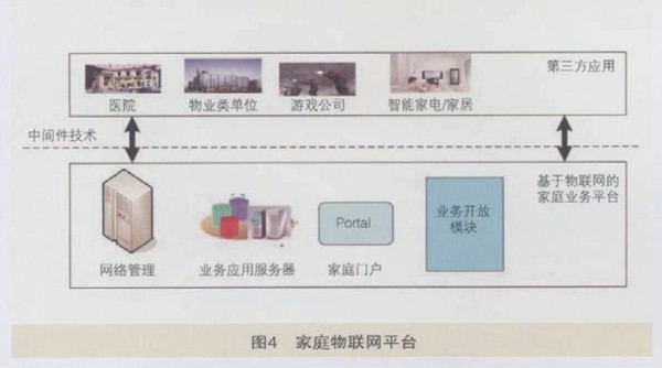 其中,核心业务能力的提供由物联网家庭业务平台完成,它是一个能力开放与服务开放的业务平台,实现家庭应用的集中管控和开通、家庭智能终端应用信息存储、转发,基本模型如图4所示。家庭业务平台由业务应用服务器、网络管理、家庭门户以及业务开放模块构成,可采用中间件技术实现新业务、新功能的持续加载,其功能如下: