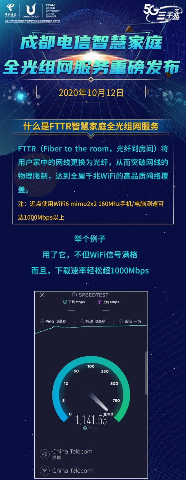 作为信息化建设主力军,2015年,中国电信助力四川建成全国首个全光网省,助力四川成都建成全国首个特大型全光网城市。2017年,助力成都建成全国首个千兆省会城市,提前三年完成“宽带中国”2020年战略目标。2019年,在成都率先发布5G三千兆+高品质信息化服务,持续引领智慧信息新生活。