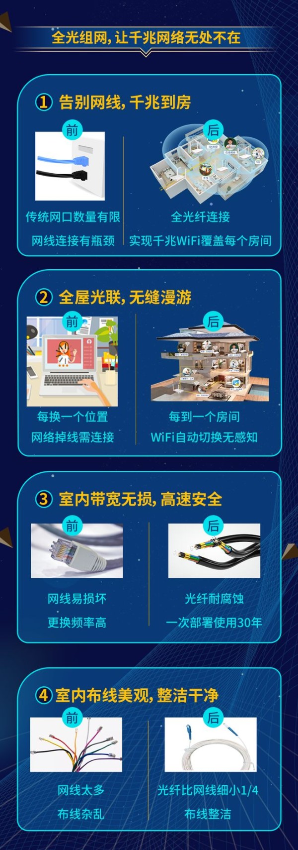 记者了解到,电信智慧家庭全光组网服务包括全光专用设备、定制化全光组网、专业化智能运维三大板块,具备四大创新点: