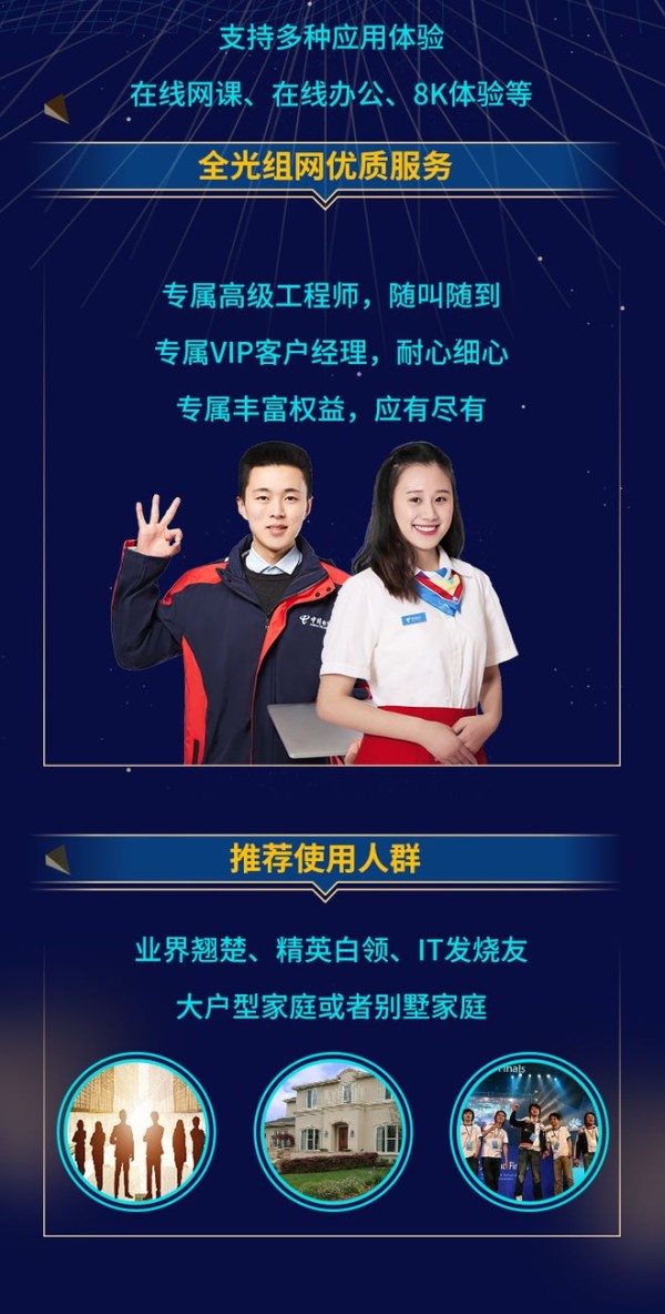 个性定制、应用畅享:由具备智慧家庭、企业组网、泛智能组网等专业技术认证和丰富经验的电信智慧家庭高级工程师提供全光组网上门定制服务,智能光网关+边缘光网关组网,畅享有线宽带、5G和Wi-Fi千兆网速带来的丰富多彩的智能信息生活应用。