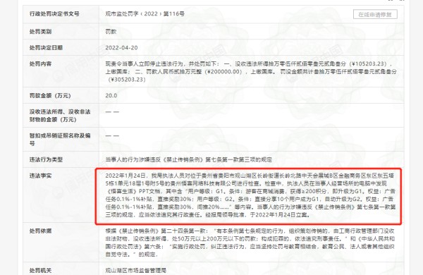 行政处罚决定书显示,2022年1月24日,贵州省贵阳市观山湖区市场监督管理局执法人员对位于观山湖区某商务区的贵州悟喜网络科技有限公司进行检查。在悟喜网络科技公司经营场所的电脑中发现《悟喜生活》PPT文档,其中含“用户等级:G1,条件:游客在商城消费,获得≥200积分,即升级为G1。权益有:广告任务0.1%-1%补贴,直推奖励30%。用户等级:G2,条件:直接分享10个用户成为G1,自动升级为G2。权益:广告任务0.1%-1%补贴,直推奖励30%,间推20%……”等内容。