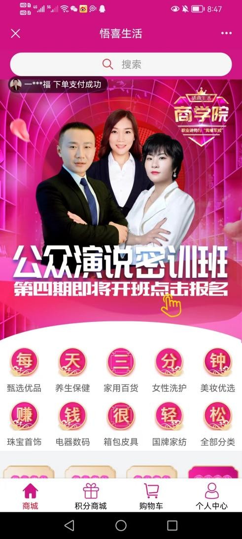 中国质量新闻网手机下载“悟喜生活APP”,APP首页介绍,悟喜生活为广告电商模式开创者,并宣称“每天三分钟,赚钱很轻松”。经过注册登录,“悟喜生活APP”依旧在正常运营,其商城有养生保健、家用百货、女性洗护、美妆优选、珠宝首饰、电器数码等多种产品分类。