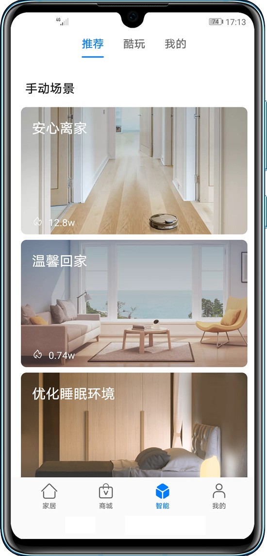 一、 安卓系统机器,打开智慧生活App,打开智能界面,可以选择手动场景中的“安心离家”、“温馨回家”、“优化睡眠环境”、“清洁净化”等模式;