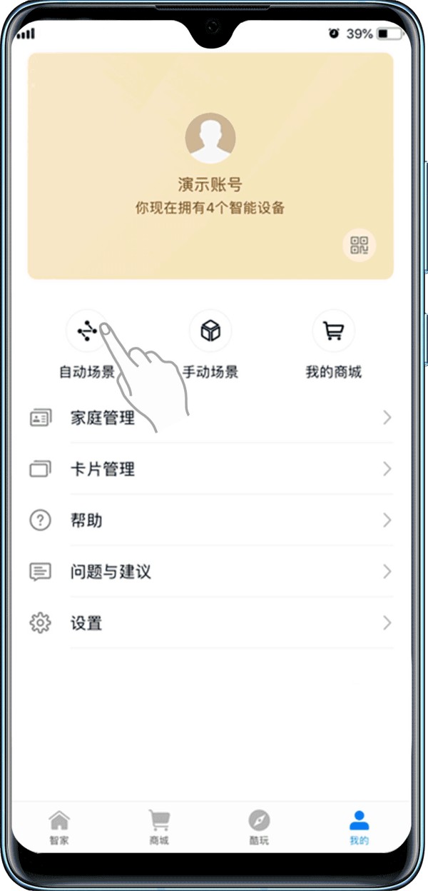 1.进入App,选择“我的”页面,点击 “自动场景”;
