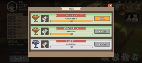 【日程安排】玩家需要平衡好学习和娱乐两项,前者会提高父母满意度和自身压力,后者相反。若平衡不好,会遭到父母的责罚,自身压力过大会出现心理问题,对属性有削减作用。同时,安排完日程后,也会遇到很多特殊事件,回味与父母的点点滴滴,以及这些小事带来的影响。