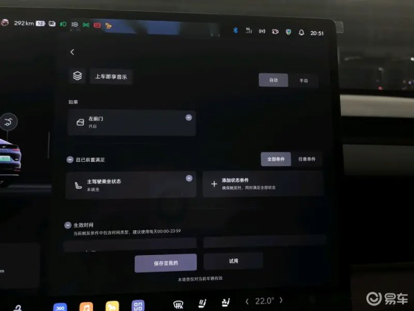 条件:左前门打开 且前置已满足:主驾驶乘坐未就座 触发:主驾位置加载到自定义位置(自定义位置可在座椅调节里设置好保存) 生效时间:每天,00:00-23:59给你满满的迎接仪式感,情绪价值拉满,自定义位置可以比离车的时候的位置设置的再后面一点,这样场景启动后座椅会退的更后面。