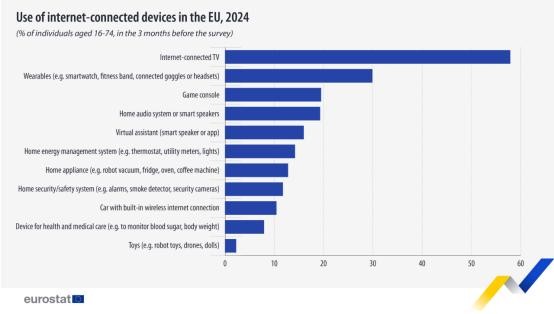 在不同类型的智能物联网设备中,欧盟居民偏好比较明显。智能电视是迄今为止最常用的设备,大约57.9%接受调研的居民表示使用智能电视。其次是智能可穿戴设备,29.9%的受访者表示使用智能穿戴设备,包括智能手表和健身追踪器。近五分之一的居民表示他们使用游戏机(19.5%)和联网家庭音响系统(19.3%),16%的人表示他们使用智能音箱形式的虚拟助手。家庭自动化设备也是智能物联网的重要形态,2024年,14.2%的居民使用联网的家庭能源管理系统,12.8%的人使用智能家电,11.8%的人使用智能家居安全设备。最后,10.5%的居民表示使用内置无线连接的汽车,7.9%的居民表示使用与健康相关的物联网设备,2.3%的居民使用联网玩具。