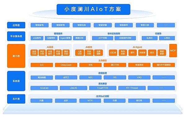 创造更智能化的美好生活体验,需要智能交互不断迭代升级。小度澜川AIoT方案以软硬一体化能力为核心,构建了覆盖芯片、系统、能力、平台、应用的全链路服务能力。