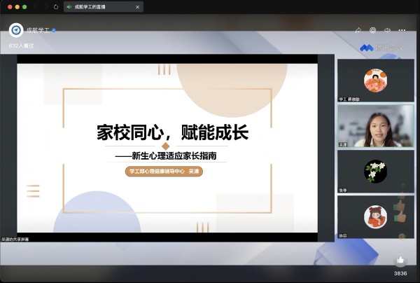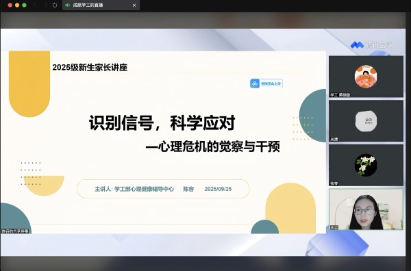 为积极构建家校协同的心理育人工作格局,助力2025级新生顺利适应大学生活,9月23日晚,学校心理健康辅导中心精心策划并举办“携手启航,‘心’怀未来”主题线上心理健康专题讲座。本次讲座由心理健康辅导中心张琴、陈容、吴潇三位专业教师担任授课讲师,为新生家长送上了一场兼具专业性与实用性的心理健康知识盛宴。