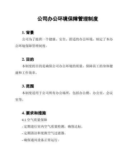 公司办公环境保障管理制度1. 背景公司为了提供一个健康、安全、舒适的办公环境,制定了本办公环境保障管理制度。