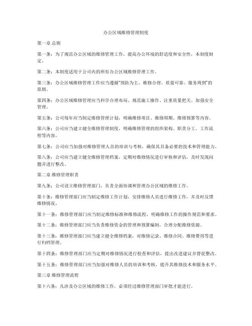 办公区域维修管理制度第一章总则第一条:为了规范办公区域的维修管理工作,提高办公环境的舒适度和安全性,本制度制定。